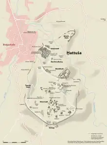 Au cours de l'histoire du royaume hittite, la capitale était généralement située à Hattusa, même si au gré des évolutions politiques (voire religieuses) elle a pu se trouver en d'autres lieux : les fondateurs du royaume ont peut-être eu Kussar ou Kanesh comme capitale, Samuha héberge la cour royale après le sac de Hattusa par les Gasgas vers 1360, Muwatalli II transfère la capitale à Tarhuntassa pour des considérations sans doute stratégiques mais peut-être aussi religieuses, tandis que les derniers feux de la dynastie royale hittite s'éteignent dans un lieu qui reste à découvrir, après l'abandon définitif de Hattusa[61]. Cette dernière a été la seule des villes royales à être fouillée, sur l'actuel site de Boğazkale (anc. Boğazköy), et elle l'est de façon quasiment continue depuis les années 1930 par des équipes allemandes qui en ont fait l'un des sites les mieux connus de tout le Proche-Orient ancien, même si beaucoup reste encore à découvrir. Les principaux monuments politiques et religieux y ont été dégagés. Le site s'étend sur environ 160 hectares dans un lieu montagneux, rocailleux et par endroits très escarpé. Il était protégé par plusieurs lignes de murailles épousant merveilleusement la topographie et s'appuyant souvent sur les promontoires rocheux. Plusieurs espaces sont ainsi isolés : une « Ville basse » au Nord, une plus vaste « Ville haute » au Sud, et à l'Est à la limite des deux se dressait l'acropole nommée aujourd'hui Büyükkale (la « Grande forteresse »), où se trouvait le palais royal[62]. Les fondements des murailles principales étaient constitués de gros moellons de belle taille (« appareil cyclopéen »), surmontés par des murs en briques crues. Des tours carrées se dressaient tous les trente mètres environ. Plusieurs portes ont été identifiées, en particulier les trois situées au sud de la Ville haute au-dessus du glacis de Yerkapı : la Porte du roi, la Porte des sphinx et la Porte des lions, ainsi nommées en raison des sculptures qui les gardaient. Des poternes ont été creusées sous la muraille en plusieurs endroits[63].