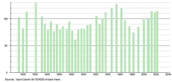L'évolution du nombre d'habitants est connue à travers les recensements de la population effectués dans la commune depuis 1793. Pour les communes de moins de 10 000 habitants, une enquête de recensement portant sur toute la population est réalisée tous les cinq ans, les populations légales des années intermédiaires étant quant à elles estimées par interpolation ou extrapolation[25]. Pour la commune, le premier recensement exhaustif entrant dans le cadre du nouveau dispositif a été réalisé en 2007[26].