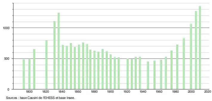 L'évolution du nombre d'habitants est connue à travers les recensements de la population effectués dans la commune depuis 1793. À partir du , les populations légales des communes sont publiées annuellement dans le cadre d'un recensement qui repose désormais sur une collecte d'information annuelle, concernant successivement tous les territoires communaux au cours d'une période de cinq ans. Pour les communes de moins de 10 000 habitants, une enquête de recensement portant sur toute la population est réalisée tous les cinq ans, les populations légales des années intermédiaires étant quant à elles estimées par interpolation ou extrapolation[5]. Pour la commune, le premier recensement exhaustif entrant dans le cadre du nouveau dispositif a été réalisé en 2005[6],[Note 1].