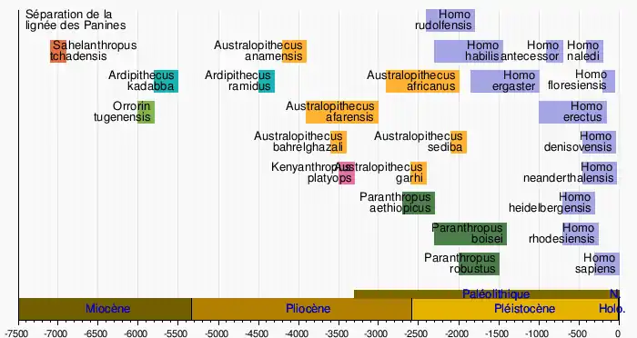 Selon la plupart des paléoanthropologues, la divergence entre Hominina et Panina (lignée des chimpanzés) remonterait à au moins 7 millions d'années[14].