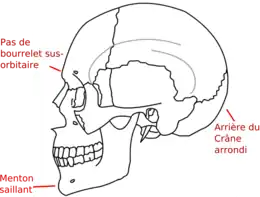 Pour les paléoanthropologues, les ossements fossiles du genre Homo peuvent être attribués à Homo sapiens s'ils présentent un certain nombre de critères distinctifs, dont les plus importants sont un volume endocrânien supérieur à 1 300 cm3, une face réduite sous la boite crânienne, un angle facial compris entre 82 et 88° (prognathisme faible à nul), un bourrelet sus-orbitaire réduit, et un menton osseux saillant.