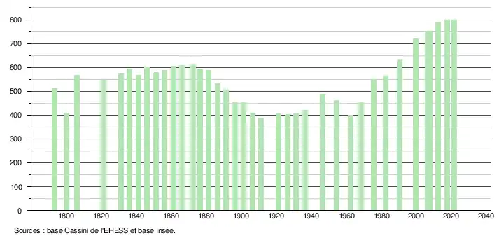 L'évolution du nombre d'habitants est connue à travers les recensements de la population effectués dans la commune depuis 1793. Pour les communes de moins de 10 000 habitants, une enquête de recensement portant sur toute la population est réalisée tous les cinq ans, les populations légales des années intermédiaires étant quant à elles estimées par interpolation ou extrapolation[22]. Pour la commune, le premier recensement exhaustif entrant dans le cadre du nouveau dispositif a été réalisé en 2007[23].