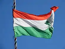 Le drapeau de la Hongrie est composé de trois bandes horizontales rouge (dessus), blanche et verte. Sa forme tricolore est inspirée du drapeau français et des idées de la Révolution de 1789 alors que ses couleurs sont une reprise des armoiries historiques de la Hongrie. Le drapeau fait sa première apparition lors de la Révolution hongroise de 1848 mais ne s'impose au sein de l'Autriche-Hongrie bicéphale qu'en 1867. Jusqu'en 1945, le drapeau est frappé d'une couronne royale en son centre. La loi fondamentale de la Hongrie entrée en vigueur en 2012 donne une interprétation officielle des couleurs : le rouge pour la force, le blanc pour la fidélité, le vert pour l'espoir.