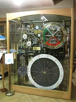 Le temps sidéral figure sur un cadran. Le globe céleste de l'horloge astronomique de Strasbourg n'a pas été repris. La précession des équinoxes est indiquée sur une cadran séparé.