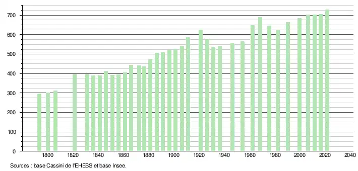 L'évolution du nombre d'habitants est connue à travers les recensements de la population effectués dans la commune depuis 1793. Pour les communes de moins de 10 000 habitants, une enquête de recensement portant sur toute la population est réalisée tous les cinq ans, les populations légales des années intermédiaires étant quant à elles estimées par interpolation ou extrapolation[26]. Pour la commune, le premier recensement exhaustif entrant dans le cadre du nouveau dispositif a été réalisé en 2006[27].