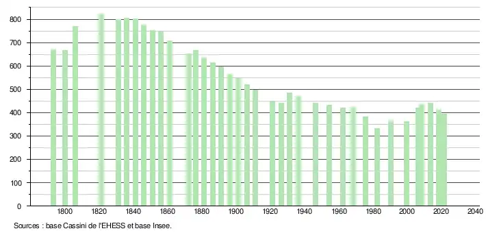 L'évolution du nombre d'habitants est connue à travers les recensements de la population effectués dans la commune depuis 1793. Pour les communes de moins de 10 000 habitants, une enquête de recensement portant sur toute la population est réalisée tous les cinq ans, les populations légales des années intermédiaires étant quant à elles estimées par interpolation ou extrapolation[24]. Pour la commune, le premier recensement exhaustif entrant dans le cadre du nouveau dispositif a été réalisé en 2008[25].