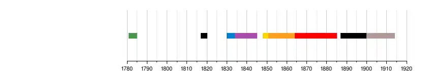 | 1866 | 1867 | 1868 | 1874 | 1875 | 1883 | 1885 | 1890 | 1897 | 1906 | 1912 | |