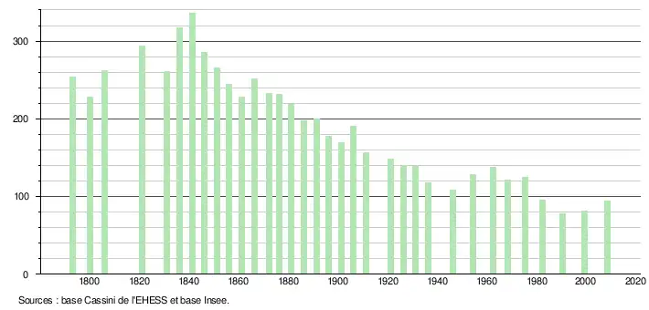 - Dans le tableau des recensements et le graphique, par convention dans Wikipédia, le principe a été retenu, pour les populations légales postérieures à 1999 de n’afficher dans le tableau des recensements et le graphique que les populations correspondant à l'année 2006, première population légale publiée calculée conformément aux concepts définis dans le décret no 2003-485 du 5 juin 2003, et les années correspondant à une enquête exhaustive de recensement pour les communes de moins de 10 000 habitants, ainsi que la dernière population légale publiée par l’Insee.