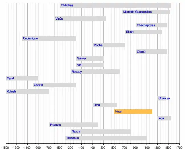 La culture Huari était une culture politique et sociale d'État qui a émergé vers 500-550 (bien qu'il y ait de nombreuses divergences sur les dates parmi les chercheurs). Dorothy Menzel a divisé la culture Huari en six étapes[3].