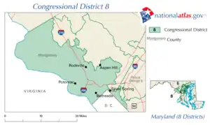 Le 8e district congressionnel du Maryland est un district de l'État américain du Maryland, il est entièrement concentré dans le Comté de Montgomery. Adjacent à Washington, D.C., le 8e district comprend bon nombre des banlieues intérieures les plus riches de la ville, notamment Bethesda, Chevy Chase et Potomac. Il comprend également plusieurs communautés plus diversifiées sur le plan économique et racial, dont les plus peuplées sont Rockville et Silver Spring.