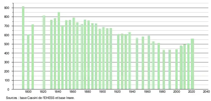 L'évolution du nombre d'habitants est connue à travers les recensements de la population effectués dans la commune depuis 1793. Pour les communes de moins de 10 000 habitants, une enquête de recensement portant sur toute la population est réalisée tous les cinq ans, les populations légales des années intermédiaires étant quant à elles estimées par interpolation ou extrapolation[31]. Pour la commune, le premier recensement exhaustif entrant dans le cadre du nouveau dispositif a été réalisé en 2005[32].