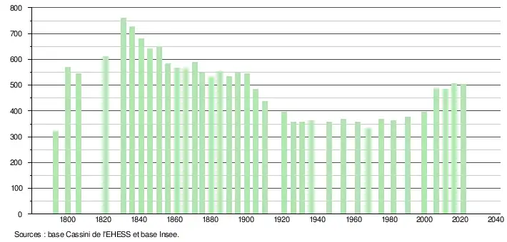 L'évolution du nombre d'habitants est connue à travers les recensements de la population effectués dans la commune depuis 1793. Pour les communes de moins de 10 000 habitants, une enquête de recensement portant sur toute la population est réalisée tous les cinq ans, les populations légales des années intermédiaires étant quant à elles estimées par interpolation ou extrapolation[17]. Pour la commune, le premier recensement exhaustif entrant dans le cadre du nouveau dispositif a été réalisé en 2006[18].