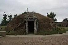 Reconstitution d'une hutte de terre au site historique national de Knife River Indian Villages