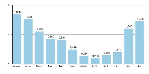 Sur cette courte période d'observation[note 2], le débit journalier maximal a été observé le pour 23,10 m3/s. Le débit instantané maximal a été observé le [note 3] avec 56,00 m3/s en même temps que la hauteur maximale instantanée de 261 mm soit 2,61 m[2].