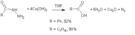 L'hydroxyde de cuivre(II) transforme également les acides hydrazides en acides carboxyliques à température ambiante. Cela est particulièrement utile lors de la synthèse d'acides carboxyliques avec des groupes fonctionnels fragiles. Les rendements affichés sont généralement excellents, comme c'est le cas avec la production d'acide benzoïque et acide octanoïque :