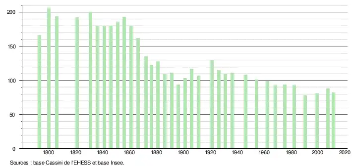 L'évolution du nombre d'habitants est connue à travers les recensements de la population effectués dans la commune depuis 1793. À partir du , les populations légales des communes sont publiées annuellement dans le cadre d'un recensement qui repose désormais sur une collecte d'information annuelle, concernant successivement tous les territoires communaux au cours d'une période de cinq ans. Pour les communes de moins de 10 000 habitants, une enquête de recensement portant sur toute la population est réalisée tous les cinq ans, les populations légales des années intermédiaires étant quant à elles estimées par interpolation ou extrapolation[12]. Pour la commune, le premier recensement exhaustif entrant dans le cadre du nouveau dispositif a été réalisé en 2007[13],[Note 1].