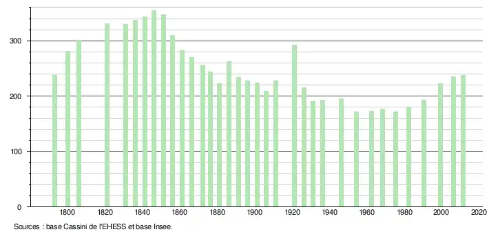 L'évolution du nombre d'habitants est connue à travers les recensements de la population effectués dans la commune depuis 1793. À partir du , les populations légales des communes sont publiées annuellement dans le cadre d'un recensement qui repose désormais sur une collecte d'information annuelle, concernant successivement tous les territoires communaux au cours d'une période de cinq ans. Pour les communes de moins de 10 000 habitants, une enquête de recensement portant sur toute la population est réalisée tous les cinq ans, les populations légales des années intermédiaires étant quant à elles estimées par interpolation ou extrapolation[13]. Pour la commune, le premier recensement exhaustif entrant dans le cadre du nouveau dispositif a été réalisé en 2006[14],[Note 1].