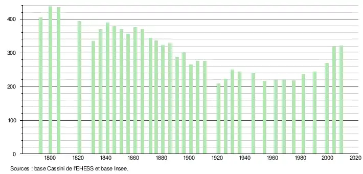 - Dans le tableau des recensements et le graphique, par convention dans Wikipédia, le principe a été retenu, pour les populations légales postérieures à 1999 de n’afficher dans le tableau des recensements et le graphique que les populations correspondant à l'année 2006, première population légale publiée calculée conformément aux concepts définis dans le décret no 2003-485 du 5 juin 2003, et les années correspondant à une enquête exhaustive de recensement pour les communes de moins de 10 000 habitants, ainsi que la dernière population légale publiée par l’Insee.