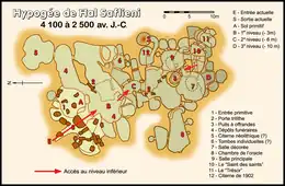 Le site comporte une cinquantaine de salles sur une superficie d'environ 2 500 m2 réparties sur quatre niveaux[4] : le niveau du sol primitif, le premier niveau à environ – 3 m de profondeur, le deuxième niveau à environ – 6 m et le troisième niveau à – 10 m. Il a été creusé entre 4100 et En l'état actuel des connaissances, l'apparition du bronze à Malte datant d'environ , le creusement des salles de l'hypogée de Ħal Saflieni ne peut donc avoir été réalisé au moyen d'outils en bronze.