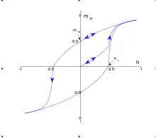 La relation entre la force du champ (H) et l'aimantation (M) n'est pas linéaire. Ainsi, si le matériau est démagnétisé (H = M = 0), alors la courbe d'aimantation initiale augmente rapidement au début, puis devient asymptotique en atteignant le point de saturation magnétique (en). Si, par la suite, le champ magnétique est réduit de manière monotone, alors M suit une courbe différente, d'où le phénomène d'hystérésis[1]. Lorsque le champ devient nul, l'aimantation est décalée de l'origine d'une valeur égale à la rémanence[1].