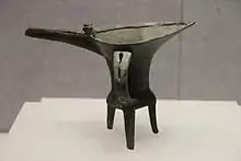 - Vers 1900-1500 av. J.-C. : culture d'Erlitou. Un premier état territorial se développe dans le Henan du centre et de l'Ouest et le sud du Shanxi : palais, temples, fonte du bronze, os oraculaires[52]. Il va progressivement contrôler les routes menant aux ressources naturelles (sel, cuivre, étain) et serait lié à la dynastie mythique des Xia. L'absence de murailles et l'utilisation de vaisselle rituelle en bronze par les élites caractérise les cités des premières dynasties chinoises[53].
