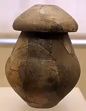 - Vers 900-500 av. J.-C. : la civilisation villanovienne pro-étrusque succède aux cultures Terramares et proto-villanovienne dans le nord du Latium et en Toscane[21]. La civilisation villanovienne regroupe deux groupes de populations assez proches mais culturellement différents, l’un au Nord, autour de Bologne (Culture de San Vitale, 950/750 av. J.-C.[22]), l’autre en Toscane et dans les environs de Rome (culture latiale), et jusque dans le sud, jusqu’à Salerne au VIIIe siècle av. J.-C. La première phase du Villanovien en Étrurie est caractérisé par des tombes à puits dans lesquelles les cendres sont déposées à l’intérieur d’urnes biconiques ou d’« urnes cabanes » en argile. La céramique est en impasto (argile grossière) et seuls les rasoirs, les armes et les fibules sont en bronze. Le fer, qui était utilisé, a le plus souvent disparu sous l’oxydation. On ne note pas d’influences extérieures jusqu’en 740/700 av. J.-C.[23].