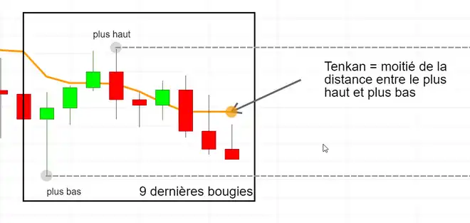 Souvent abrégée en « Tenkan » ou TS, il s'agit du milieu entre la valeur du plus haut et la valeur du plus bas sur les neuf dernières périodes observées (en horaire une session de bourse compte neuf heures). Cela peut être vu comme le prix d'équilibre (le milieu entre le plus haut et le plus bas) sur neuf périodes de cotation :