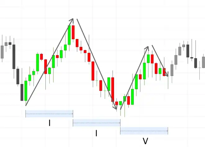 - une vague V : il s'agit d'une vague avec deux segments, composée d'une impulsion (une vague I) et d'un mouvement correctif ;