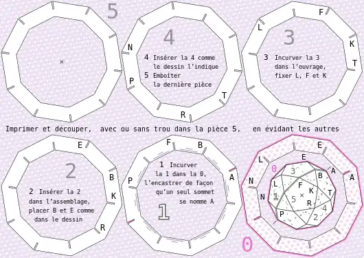 Ci‑dessus décoré de pois, le décagone a quatre sommets qui se nomment A, E, L et N. Ainsi nommés, ils se retrouvent sur les pièces décagonales détachées, dont les six centres de symétrie se confondront dans la structure assemblée, en son centre de symétrie dans l’espace. Les bords extérieurs des pièces imbriquées seront alors les soixante arêtes de l’icosidodécaèdre, dessiné en perspective dans l’évidement de la pièce 0. Dessins et découpages précèderont l’assemblage, bien sûr. En attendant de géniales découpeuses programmables dans les écoles, envisagées quand la planète Mars aura perdu tout attrait, répéter des tracés de polygones réguliers sera beaucoup moins fastidieux grâce au langage SVG. Mieux vaut débuter en SVG en dessinant les trois carrés imbriqués des arêtes d’un octaèdre régulier, dans une première phase, et dans une deuxième phase les quatre sections hexagonales régulières d’un cuboctaèdre, avant de coder les six pièces ici présentes, en phase 3.