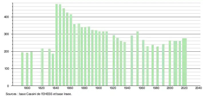 L'évolution du nombre d'habitants est connue à travers les recensements de la population effectués dans la commune depuis 1793. Pour les communes de moins de 10 000 habitants, une enquête de recensement portant sur toute la population est réalisée tous les cinq ans, les populations légales des années intermédiaires étant quant à elles estimées par interpolation ou extrapolation[48]. Pour la commune, le premier recensement exhaustif entrant dans le cadre du nouveau dispositif a été réalisé en 2008[49].