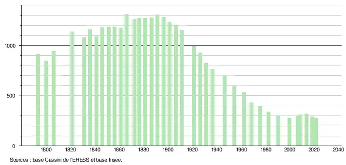 L'évolution du nombre d'habitants est connue à travers les recensements de la population effectués dans la commune depuis 1793. Pour les communes de moins de 10 000 habitants, une enquête de recensement portant sur toute la population est réalisée tous les cinq ans, les populations légales des années intermédiaires étant quant à elles estimées par interpolation ou extrapolation[23]. Pour la commune, le premier recensement exhaustif entrant dans le cadre du nouveau dispositif a été réalisé en 2008[24].