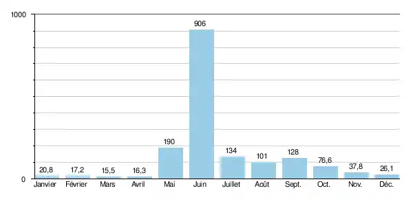 Le débit moyen mensuel observé en mars (minimum d'étiage) est de 15,5 m3/s, tandis que le débit moyen du mois de juin, maximum de l'année, atteint 906 m3/s, ce qui témoigne de l'amplitude très importante des variations saisonnières. Sur la durée d'observation de 38 ans, le débit mensuel minimal a été de 2,98 m3/s au mois de , tandis que le débit mensuel maximal s'est élevé à 1 670 m3/s en .