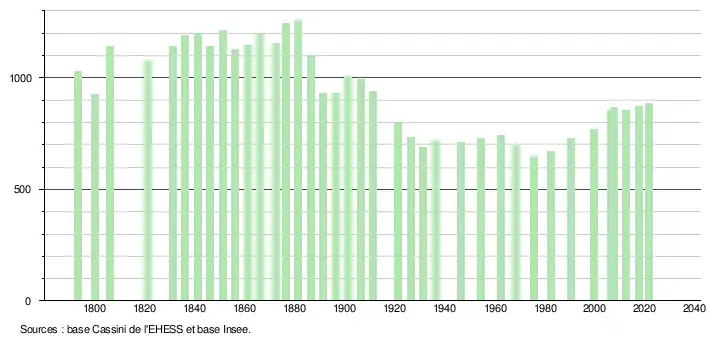L'évolution du nombre d'habitants est connue à travers les recensements de la population effectués dans la commune depuis 1793. Pour les communes de moins de 10 000 habitants, une enquête de recensement portant sur toute la population est réalisée tous les cinq ans, les populations légales des années intermédiaires étant quant à elles estimées par interpolation ou extrapolation[19]. Pour la commune, le premier recensement exhaustif entrant dans le cadre du nouveau dispositif a été réalisé en 2007[20].