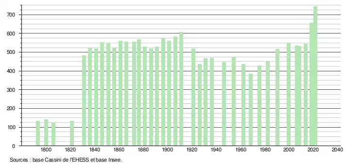 L'évolution du nombre d'habitants est connue à travers les recensements de la population effectués dans la commune depuis 1793. Pour les communes de moins de 10 000 habitants, une enquête de recensement portant sur toute la population est réalisée tous les cinq ans, les populations légales des années intermédiaires étant quant à elles estimées par interpolation ou extrapolation[20]. Pour la commune, le premier recensement exhaustif entrant dans le cadre du nouveau dispositif a été réalisé en 2008[21].