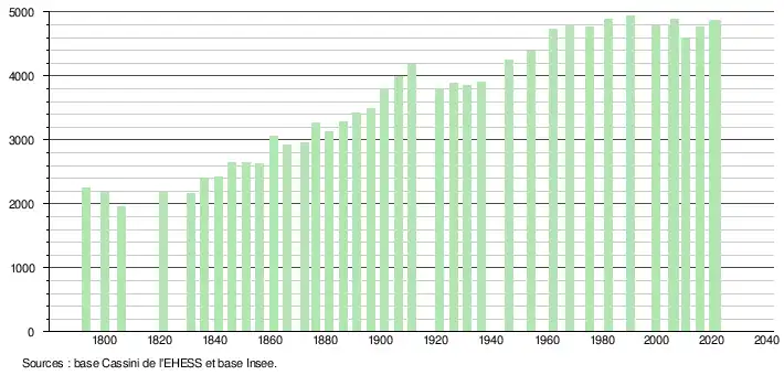 L'évolution du nombre d'habitants est connue à travers les recensements de la population effectués dans la commune depuis 1793. Pour les communes de moins de 10 000 habitants, une enquête de recensement portant sur toute la population est réalisée tous les cinq ans, les populations légales des années intermédiaires étant quant à elles estimées par interpolation ou extrapolation[45]. Pour la commune, le premier recensement exhaustif entrant dans le cadre du nouveau dispositif a été réalisé en 2005[46].