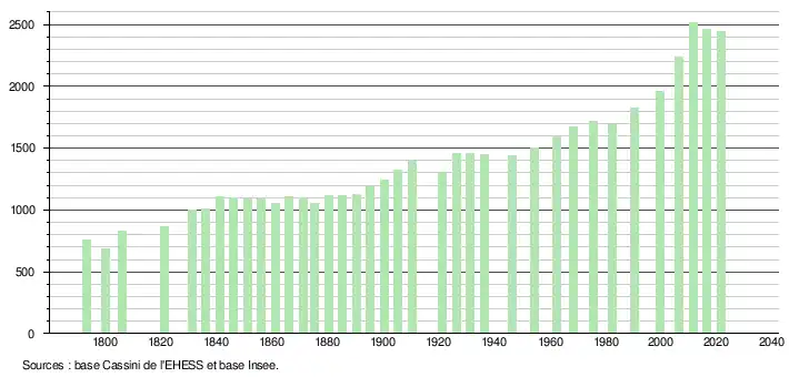 L'évolution du nombre d'habitants est connue à travers les recensements de la population effectués dans la commune depuis 1793. Pour les communes de moins de 10 000 habitants, une enquête de recensement portant sur toute la population est réalisée tous les cinq ans, les populations légales des années intermédiaires étant quant à elles estimées par interpolation ou extrapolation[28]. Pour la commune, le premier recensement exhaustif entrant dans le cadre du nouveau dispositif a été réalisé en 2006[29].