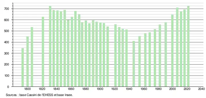 L'évolution du nombre d'habitants est connue à travers les recensements de la population effectués dans la commune depuis 1793. Pour les communes de moins de 10 000 habitants, une enquête de recensement portant sur toute la population est réalisée tous les cinq ans, les populations légales des années intermédiaires étant quant à elles estimées par interpolation ou extrapolation[22]. Pour la commune, le premier recensement exhaustif entrant dans le cadre du nouveau dispositif a été réalisé en 2006[23].