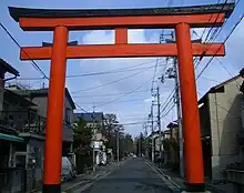 La rue vue vers le mont Funaoka, au sud, et son grand torii. | |