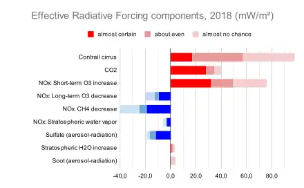 - la destruction de méthane, gaz à effet de serre puissant d'une durée de vie de 12 ans, donc un refroidissement. En 1992, la part du trafic aérien dans la concentration atmosphérique de méthane était estimée à 2 %[15]. Son forçage radiatif est de −0,010 4 W/m2 (évaluation du GIEC pour 2000)[14].