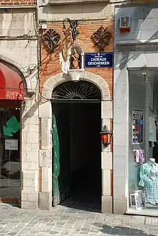 L'entrée de l'impasse des Cadeaux se situe à l'extrémité gauche de ce bâtiment. Datant de la rénovation de 1946, cette porte est constituée de piédroits harpés en pierre de taille supportant un arc en anse de panier sur lequel est gravé le nom de l'estaminet qui occupe le fond de l'impasse : « À l'Imaige Nostre-Dame ».