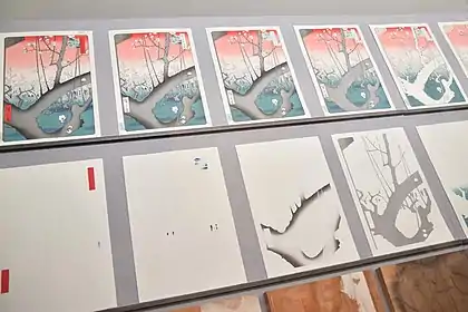 - Nishiki-e (錦絵, « images de brocard ») — Procédé d'utilisation de blocs multiples pour des portions distinctes de l'image, en utilisant un certain nombre de couleurs pour obtenir des images complexes et détaillées. Un bloc séparé est sculpté pour appliquer uniquement sur la partie de l'image destinée à recevoir une seule couleur. Des marques d'identification appelées kentō (見当) sont utilisées pour assurer la correspondance entre l'application de chaque bloc.