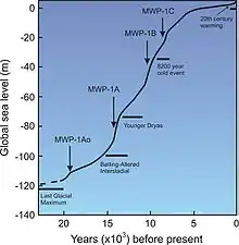 |   Courbe indiquant l'augmentation du niveau des mers depuis la fin de la dernière période glaciaire. L’impulsion de fonte 1A y est indiquée. | |