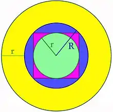 On considère un compact convexe non vide S, un cercle inscrit, de rayon r et un cercle circonscrit C de rayon R. Cette situation est illustrée sur la figure de gauche, le compact convexe est le carré violet, le cercle C est illustré en bleu et le cercle inscrit en vert. La technique utilisée consiste à considérer la zone bleue Z correspondant aux points de C qui ne sont pas dans S. La surface Z + rB est doublement mesurée, les symboles rB désignent ici la boule de rayon r et de centre le vecteur nul. Cette figure recouvre intégralement S et définit un disque de rayon R + r, illustré en jaune. On en déduit une première égalité :