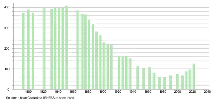 L'évolution du nombre d'habitants est connue à travers les recensements de la population effectués dans la commune depuis 1793. Pour les communes de moins de 10 000 habitants, une enquête de recensement portant sur toute la population est réalisée tous les cinq ans, les populations légales des années intermédiaires étant quant à elles estimées par interpolation ou extrapolation[16]. Pour la commune, le premier recensement exhaustif entrant dans le cadre du nouveau dispositif a été réalisé en 2006[17].