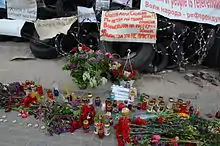 Commémoration le 10 mai 2014 en l'honneur de ceux qui sont morts dans les affrontements, devant la Maison des syndicats d'Odessa incendiée. | |
