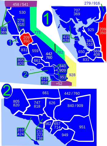 Carte de l'État de Californie avec les territoires de ses indicatifs régionaux. L'indicatif régional 209 est en rouge.