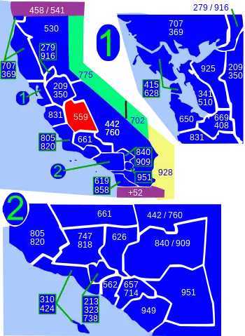 Carte de l'État de Californie avec les territoires de ses indicatifs régionaux. L'indicatif régional 559 est en rouge.