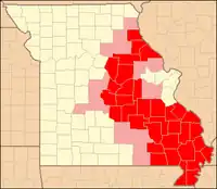 Indicatif régional 573 (rouge: complètement en 573, rose: partiel).