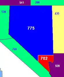 La carte indique les régions de l'État du Nevada desservies par les indicatifs régionaux 702 et 775.