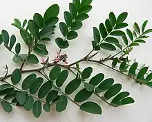 La feuille imparipennée comporte de neuf à treize folioles. Les folioles sont opposées, obovales à elliptiques, jusqu'à 25 × 12 mm, à poils clairsemés en dessous. Le pétiole et le rachis (7 cm de long) sont couverts de poils apprimés et creusés d'un sillon sur la face supérieure. Les stipules sont petites (2 mm), étroitement triangulaires.
